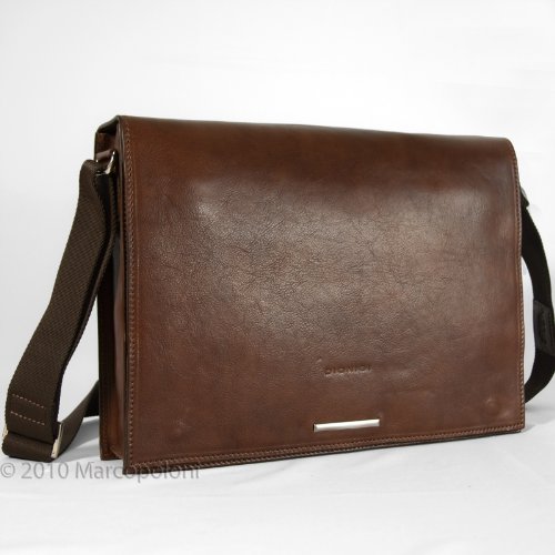 2 small interior pockets; comfortable and adjustable strap.Flap with magnetic closure, zippered pockest in the front and in the back.Collapsible laptop sleeve - holds laptop computers up to 13 W x 9.5 H x 1.5 D.Size in inches: Exterior 14.25 W x 10.5 H x 3 D; Interior 9.5 H x 13.5 W x 2.5 D.Handmade with genuine vegetable-tanned Italian leather. Finally, a full-grain leather laptop bag that is more messenger bag than briefcase! This versatile messenger is handcrafted in Italy with the finest vegetable-tanned Italian leather. It's semi-rigid structure means the bag will stand up when placed on the floor, and your laptop is protected against minor impact. (We still recommend the use of a separate padded sleeve, however, if you want to protect your laptop against more than just a gentle bump or a knock.)The flexible partition acts as a sleeve to secure your laptop in place, and protects and separates it from other items in the bag. Furthermore, the partition is cleverly designed with no bottom so it does not take away valuable space if you don't need it. When not using the bag as a computer bag, it can function as a simple divider or it can be pushed aside so you can take advantage of the full depth of the bag.Features:- Features:- Handmade with genuine vegetable-tanned Italian leather- Full flap with magnetic button closure- One main interior compartment- Collapsible partition/laptop sleeve - holds laptop computers up to 13" wide, 9.5" high and 1.